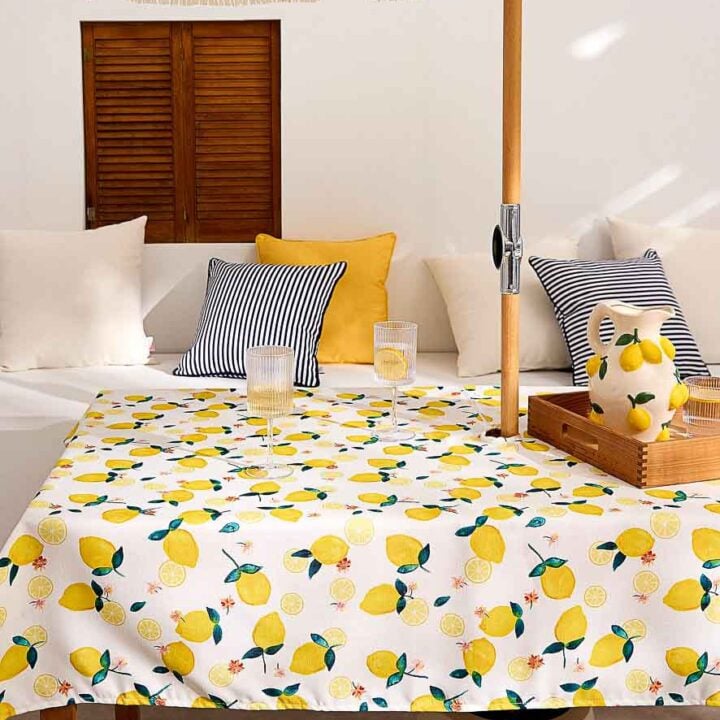 This colorful tablecloth is as pretty as it is practical since it can be used on tables that have a parasol. It is also easy to clean and machine washable.